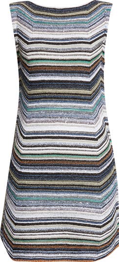 Horizontal stripes in a distinctive mix of stitches and rich tones with a glint of metallic shine create a visually striking appearance, while the sleeveless design and bateau neck add to its eclectic-minimalist appeal.