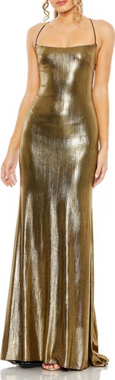 This metallic corset back column gown offers a sleek and sophisticated silhouette, combining elegance and modern style for any special occasion.