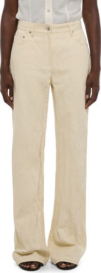 By weaving the cotton twill with fine metal filaments, these bootcut jeans achieve a softly sculptural profile by holding their shape when crushed.