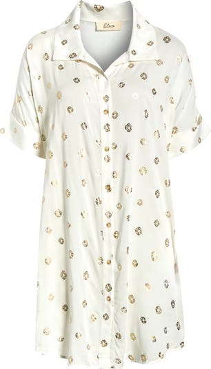 A classic shirtdress silhouette gets a vacation-ready makeover with a lightweight, drapey fabrication and a metallic dot design.