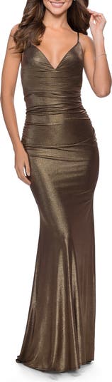 Bold and edgy metallic jersey prom dress that hugs curves in all the right places. Features flattering ruching and a V neckline. A cool tie up back finishes off the design. Back zipper closure.