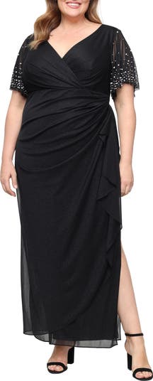 Bring the glow with a cocktail dress that catches the light as you move. Faux pearls and rhinestones dust the sleeves like constellations, while a gathered faux-wrap front flows and a side slit sets the stride. The effect reads polished glamour with a playful wink.