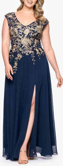 A gilded garden covers the bodice of a frothy chiffon gown that's sure to enchant from the first toast to the last dance.