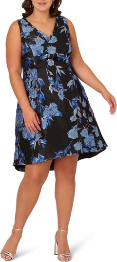 Silver-edged blooms create an enchanting style scape for a sleeveless cocktail dress designed with a high-low hemline and perfected with a pair of pockets.