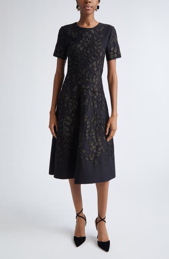 Metallic threads illuminate the tonal floral jacquard of this event-ready midi dress that's the epitome of understated elegance.