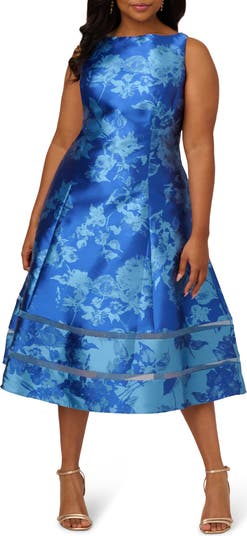 Lustrous floral jacquard and sheer stripe insets create stunning dimension on an occasion-ready midi designed with a dipped back and a perfectly flared skirt.