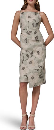 Make an elegant statement in this shimmering floral-jacquard sheath dress that's ready for your next occasion.