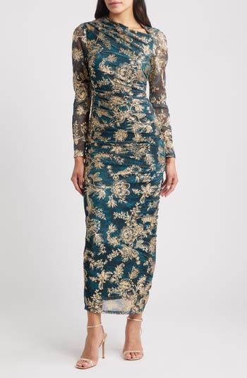 Perfectly paired with something sparkling, this gently ruched gown features and alluring angle to define the neckline.