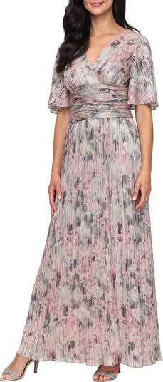 Shimmer the night away in this stunning maxi dress featuring a short-sleeve bodice with a plunging crossover neckline and a flowing A-line skirt. A subtle floral motif nicely accents the bodre fabric's metallic glint.