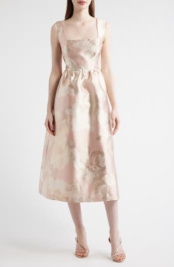 Metallic floral twill brings rich texture and luminous shine to this party-ready midi dress. Styled with a square neckline and sleeveless silhouette, it features a shirred A-line skirt that moves with playful volume. An open back adds a striking finish.