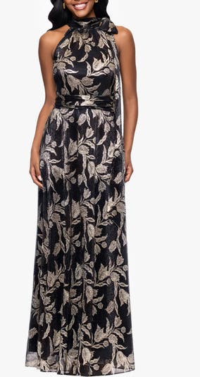 A glittering garden tells the style story for a quietly stunning sheath gown designed to showcase your shoulders.