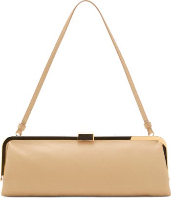 Glinting hardware and sleek faux leather highlight the East/West profile of a sleek frame clutch suspended from a slender shoulder strap for comfortable wear.