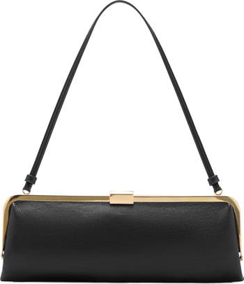 Glinting hardware and sleek faux leather highlight the East/West profile of a sleek frame clutch suspended from a slender shoulder strap for comfortable wear.