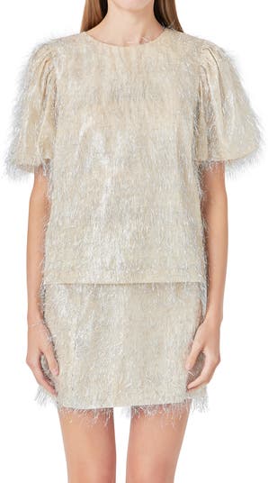 Make a shimmering statement on your next night out with this puff-sleeve top covered in metallic fringe.
