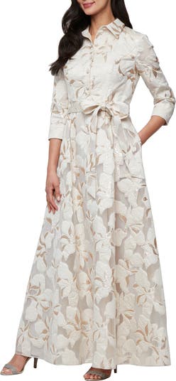 Textured, shimmer-kissed blooms twinkle as you move in this floor-sweeping ballgown. It features sweet princess seams, handy pockets and an attached bow that sits at the front.