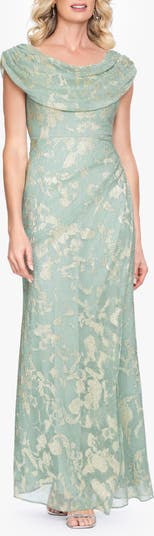 Metallic Jacquard Drape Neck Gown