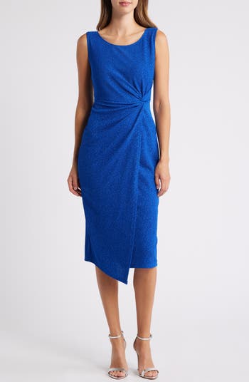 A side twist gives a faux-wrap effect to this shimmery cocktail dress that has enough stretch to keep you dancing all night long.
