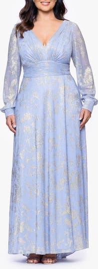 This floor-sweeping gown shimmers in the light with a metallic jacquard pattern all over while sheer sleeves add an airy vibe to the party-ready look.