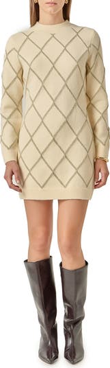 Luxe comfort takes center stage in this diamond-patterned sweater dress with a relaxed silhouette and polished vibe.