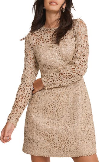 Lace dress in a mini silhouette with a crew neckline, long sleeves, zipped cuffs, stitched trim with a zip fastening through the back.