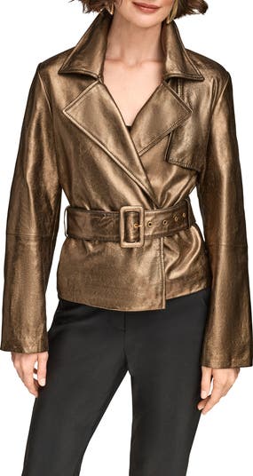 Metallic leather composition puts a glamorous twist on this classic moto jacket cinched with a matching belt.