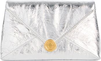 Crinkled lambskin leather lends textured shine to an envelope clutch suspended from a jewelry-inspired chain strap and secured with a logo-engraved medallion.