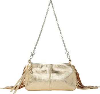 The signature Miss M bag is now available in a chic and practical Pouch version: the Miss M Pouch.Made from metallic cracked leather, it has a detachable chain handle for carrying over the shoulder or by hand, and is embellished with Maje's signature fringing on the sides. A leather pull tab featuring a Maje heart tassel opens the zip fastening, so you can slip in all your essentials.Maje offers a variety of bags in different sizes and colours to suit every mood.