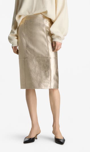A staple skirt is instantly elevated to so much more tailored from gleaming metallic leather and detailed with a matching zip and stud detaling.