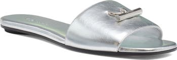 A minimalist McQueen logo is engraved on the crescent-bar hardware of a sleek slide sandal made in Italy from metallic calfskin.
