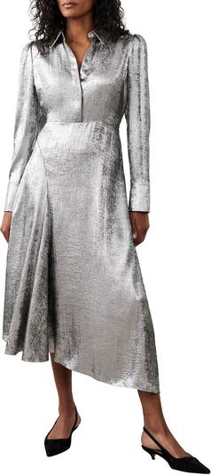Metallic shirt dress in a midi silhouette featuring a classic collar, long sleeves, buttoned cuffs, an asymmetric hemline, and a concealed button fastening through the front