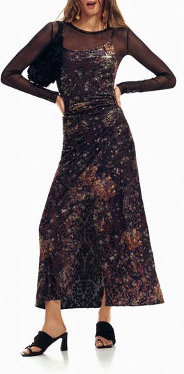 A captivating collection of eye-catching prints tells a bold style story for a boho-chic dress served with a center slit.