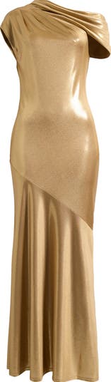 Liquid shine meets sculptural elegance in this metallic one-shoulder gown shaped with artful draping. The bodice hugs your curves with architectural grace before releasing at the hips into a fluid sweep that skims the floor.
