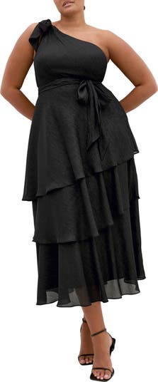 Rows of ruffles enchant the silhouette of a party-ready dress designed to show off one shoulder.