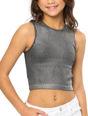 A sleek ribbed sleeveless top featuring a subtle metallic paint finish for a stylish shimmer. Made from a soft and stretchy nylon-spandex blend, this top offers a comfortable fit and modern look perfect for big kids’ everyday wear.