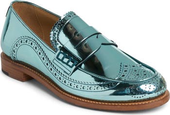 A glossy metallic finish brings eye-catching modern glamour to this iconic wingtip penny loafer.
