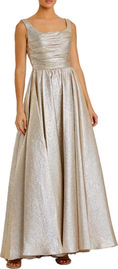 Shine bright in our Metallic Pleated Bodice Ballgown. This stunning gown features a pleated bodice and a flowing skirt, perfect for making a grand entrance at any event.