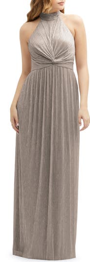 Artful twisting and knotting cinches the waist of a sweeping halter gown textured with superfine pleating dusted with light-catching metallic fibers.