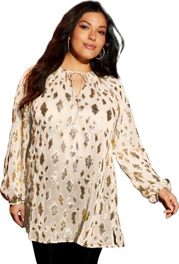 Made from breezy georgette with a metallic jacquard design with eyelash detail that adds texture and makes it feel elevated. Finished with fun tassel ties at the neckline, and sheer long sleeves. This blouse is just what you need when you want a dressy yet comfy option. Pair it with denim and top it off with a leather jacket and boots for a night out, or with a denim jacket and pumps for a day look.