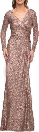 Matte metallic long evening dress with long sleeves. The dress features ruching across the waist and a V neckline. Back zipper closure.