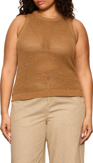 An openwork tank knit with metallic fibers gives this sleeveless look a light-catching shimmer with just enough sheerness to show off your favorite bralette or swim top underneath.
