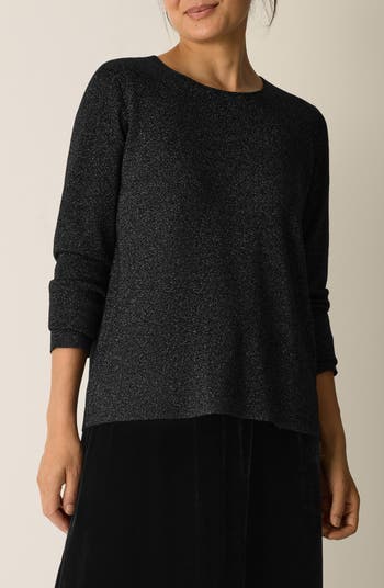 Shimmering threads send soft sparkle throughout this boxy crewneck sweater knit from a cozy and luxurious wool blend.