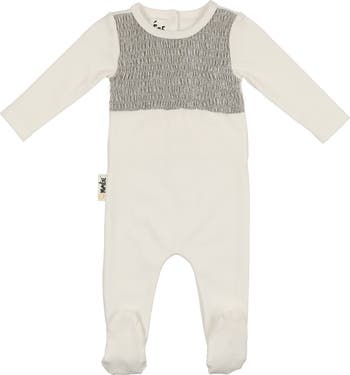 A shimmery metallic smocked bodice adds a festive touch to this comfy cotton-blend footie.