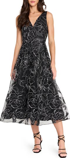 A sketchbook of blooms tells a charming style story for a cocktail dress finished with a swishy skirt and cut to a beloved and versatile midi length.