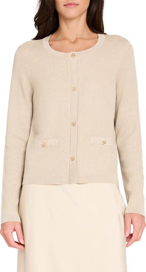 Goldtone bow buttons sweeten the look of a crewneck cardigan infused with metallic threads that provide the piece with soft shine.