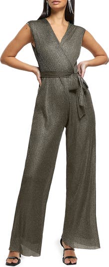 Metallic visions come to life on this statement-making jumpsuit boasting a tie waist and straight legs that channel disco vibes.