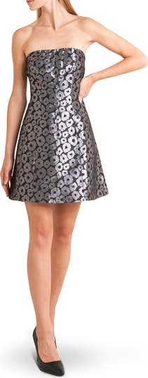 Striking metallic blooms enhance the allure of this shoulder-showing mini made with a perfectly flared skirt.