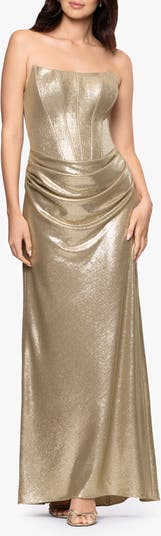 A gilded gown serves Old Hollywood glamour with a boned bustier bodice and a strapless silhouette.