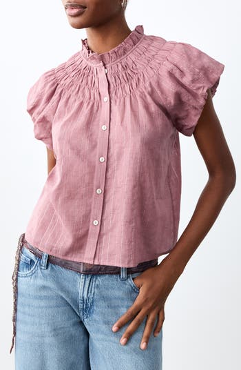 A smocked yoke and puffed sleeves bring chic texture to this button-up cotton top detailed with shimmering threads that send soft sparkle throughout.