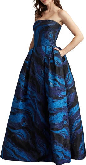 Waves of color create a captivating style story for a strapless gown simmered in shimmer and perfected with a pair of discreet pockets.