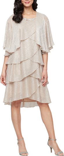 Turn heads in this shimmering metallic dress designed in a sleeveless silhouette with floaty tiered ruffles. A matching flutter-sleeve jacket completes this unforgettable look.